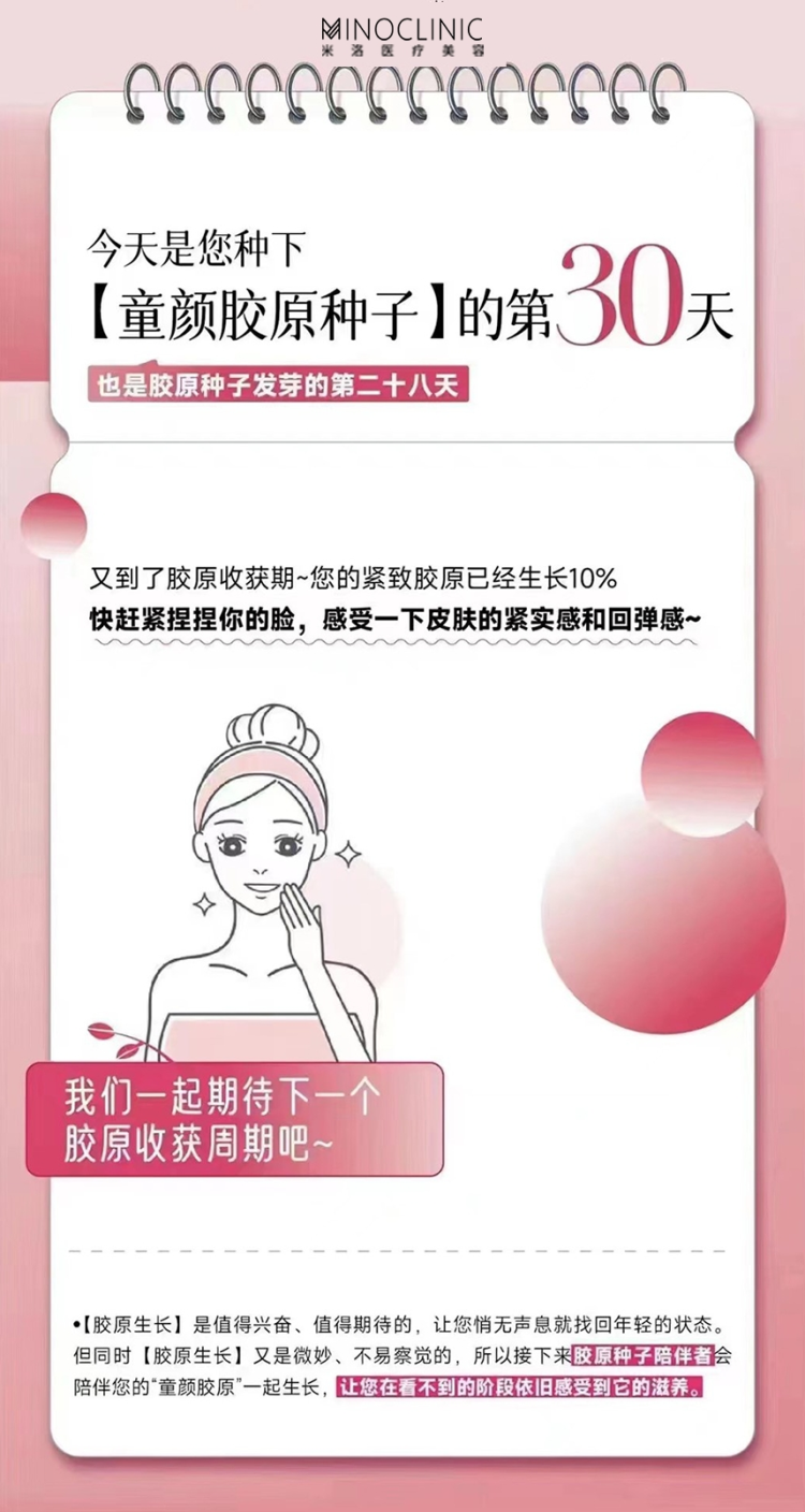 【胶原生长】是值得兴奋、值得期待的, 让您悄无声息就找回年轻的状态。 但同时【胶原生长】又是微妙、不易察觉的,所以接下来胶原种子陪伴者会陪伴您的“童颜胶原’一起生长,让您在看不到的阶段依旧感受到它的滋养