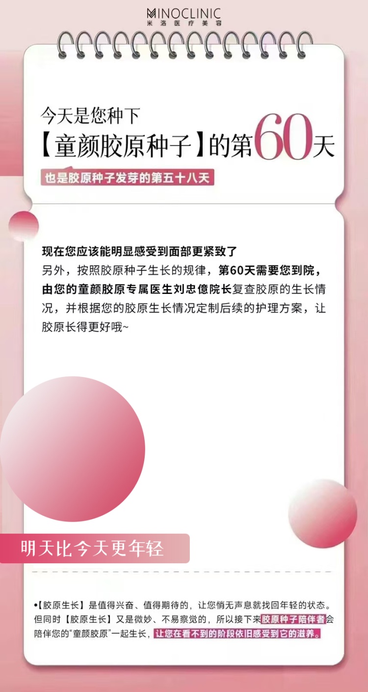 另外,按照胶原种子生长的规律,第60天需要您到院,由您的童颜胶原专属医生刘忠億院长复查胶原的生长情况,并根据您的胶原生长情况定制后续的护理方案,让胶原长得更好哦~