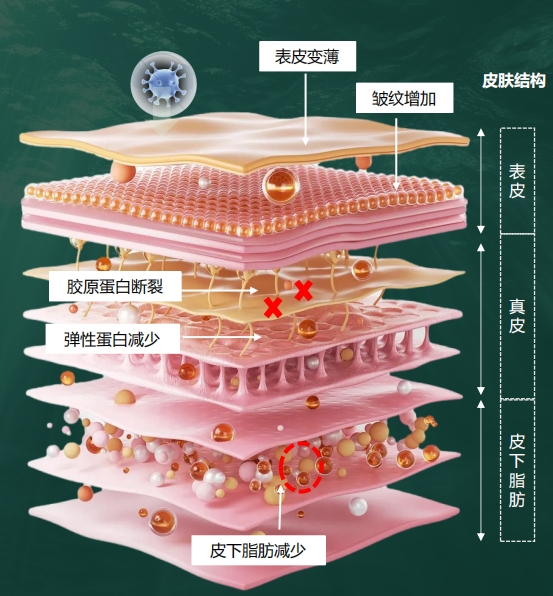 随着年龄的增加,皮肤里的胶原蛋白流失逐年递增,复原能力却逐年递减。炎症、暗沉、毛孔、雀斑等皮肤问题越来越明显,这些变化表现为明显的衰老迹象。