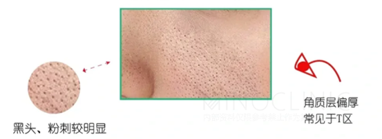 角质层厚、毛孔发黑,有黑色或米白色的圆形孔状粉刺,常见于t区位置,比较难清理。