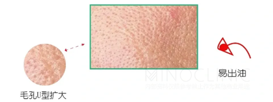毛孔呈现U型扩大、易泛油光,主要出现T区及脸两颊部位,同时肌肤泛黄、暗沉。